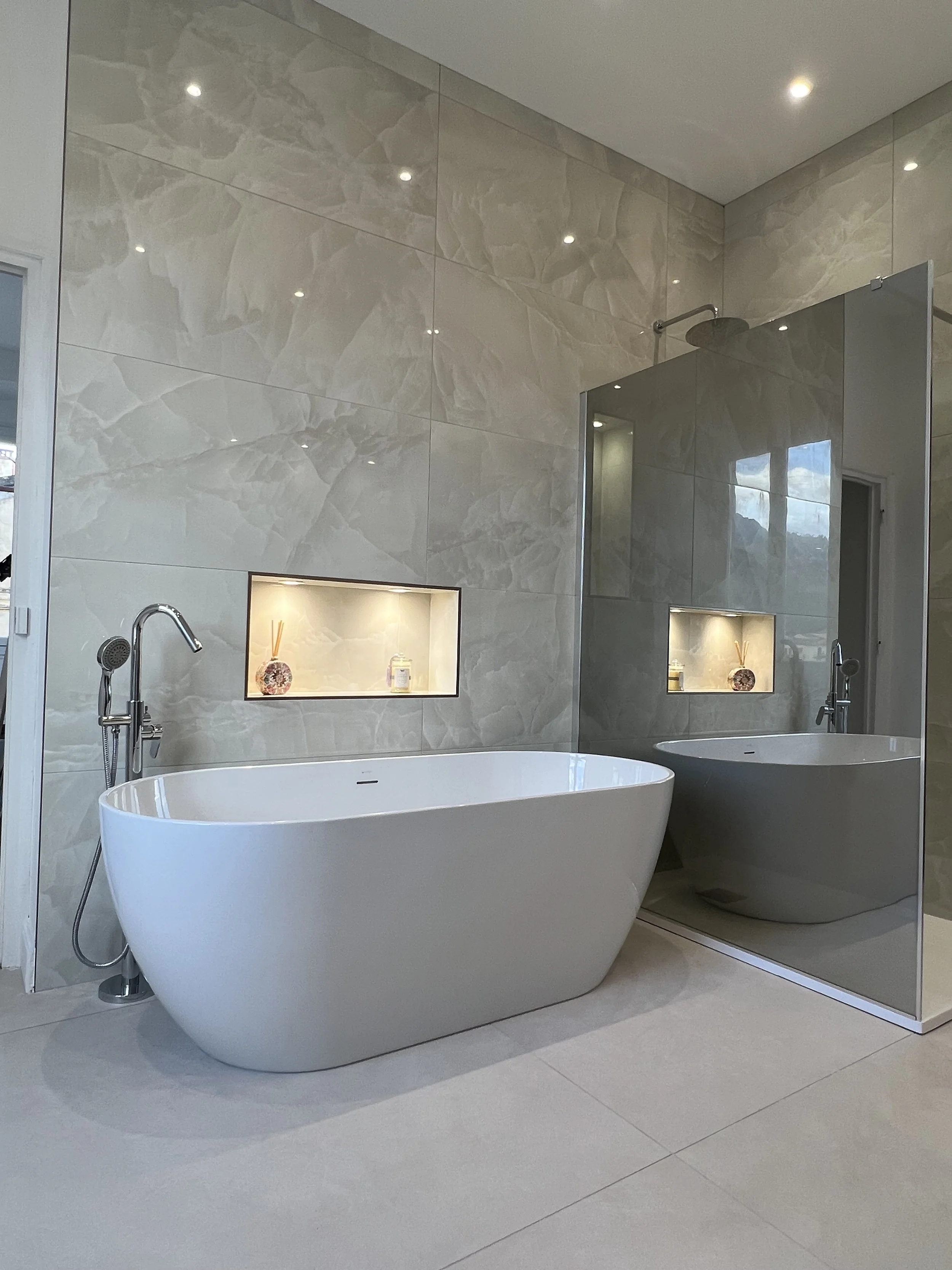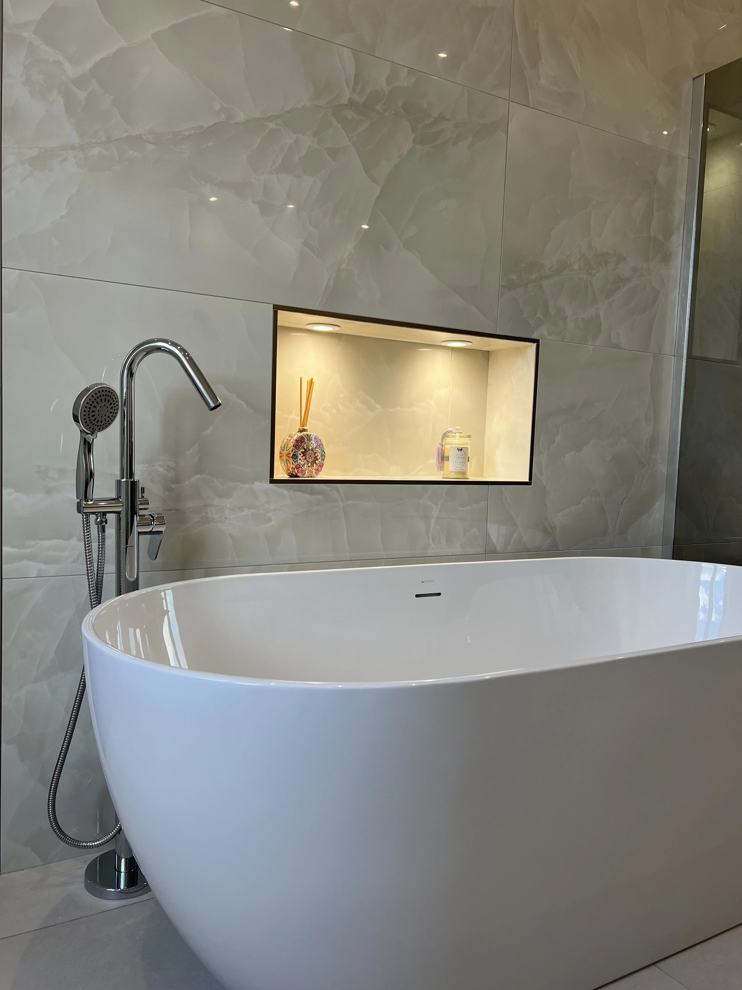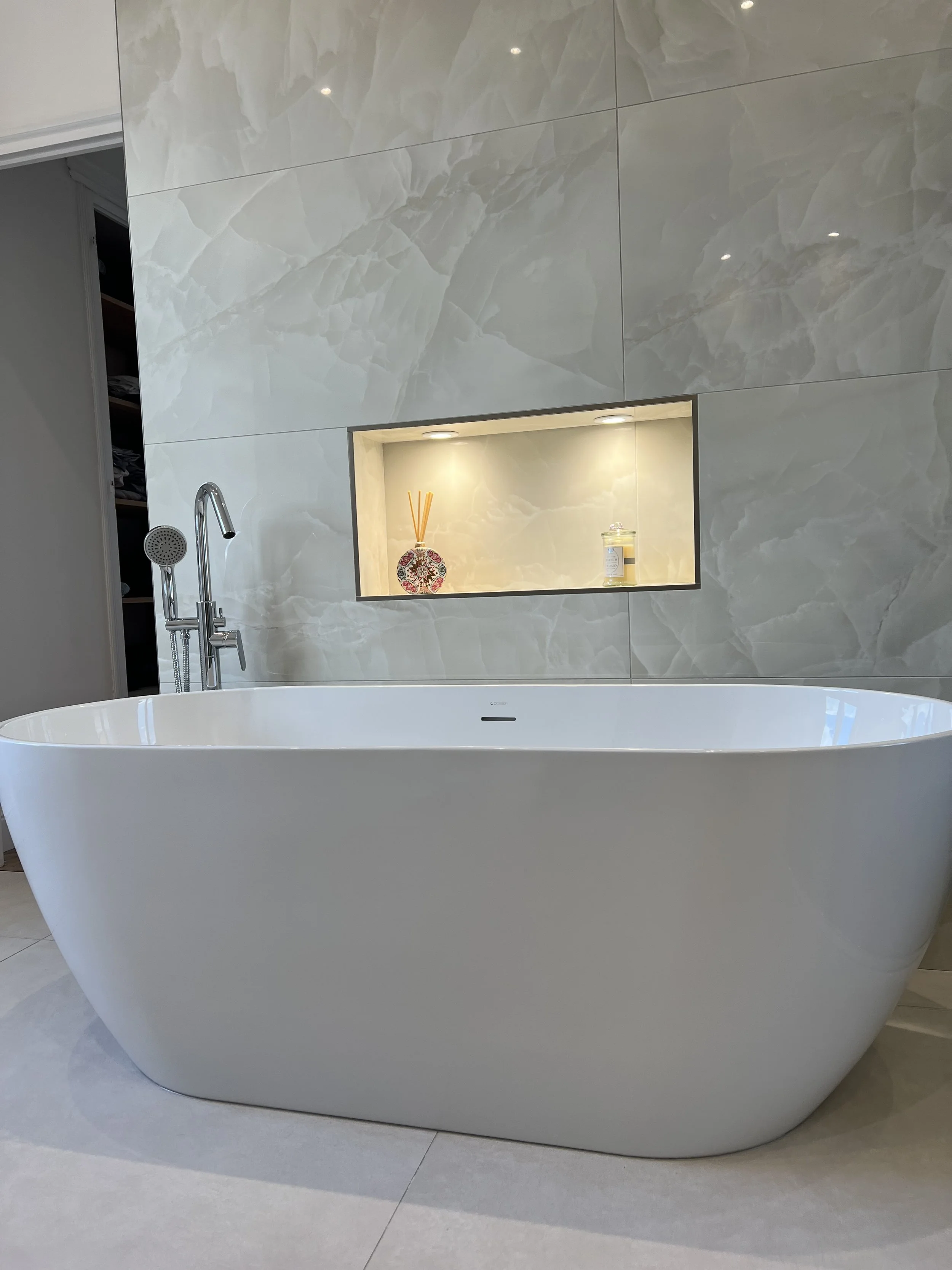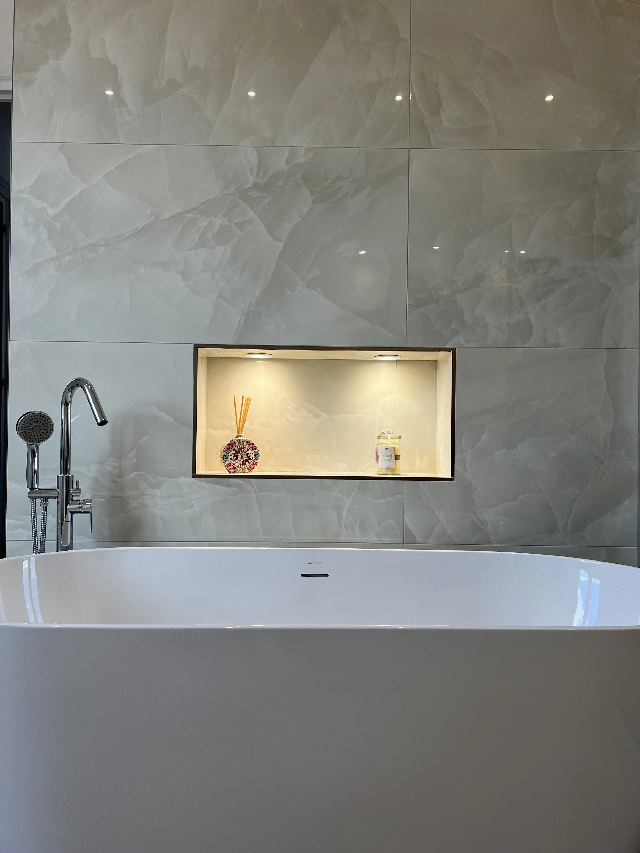 Baignoire blanche dans une salle de bain moderne avec carrelage murale gris clair et niche éclairée contenant un pot avec des bâtons parfumés et une bougie.