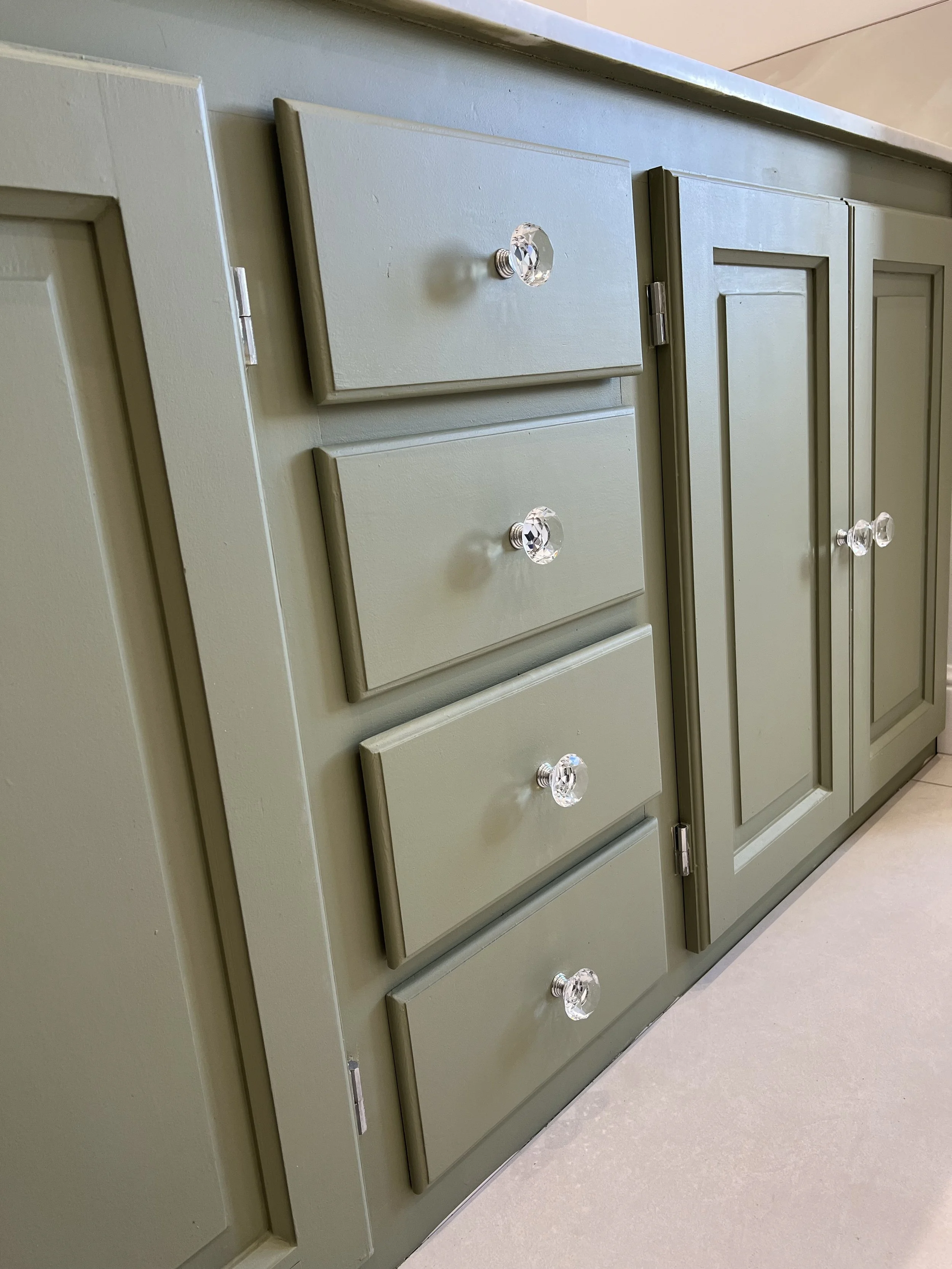 Combinaison d’un meuble existant conservé, un plan vasque façonné en pierre et d’une faïence onyx.